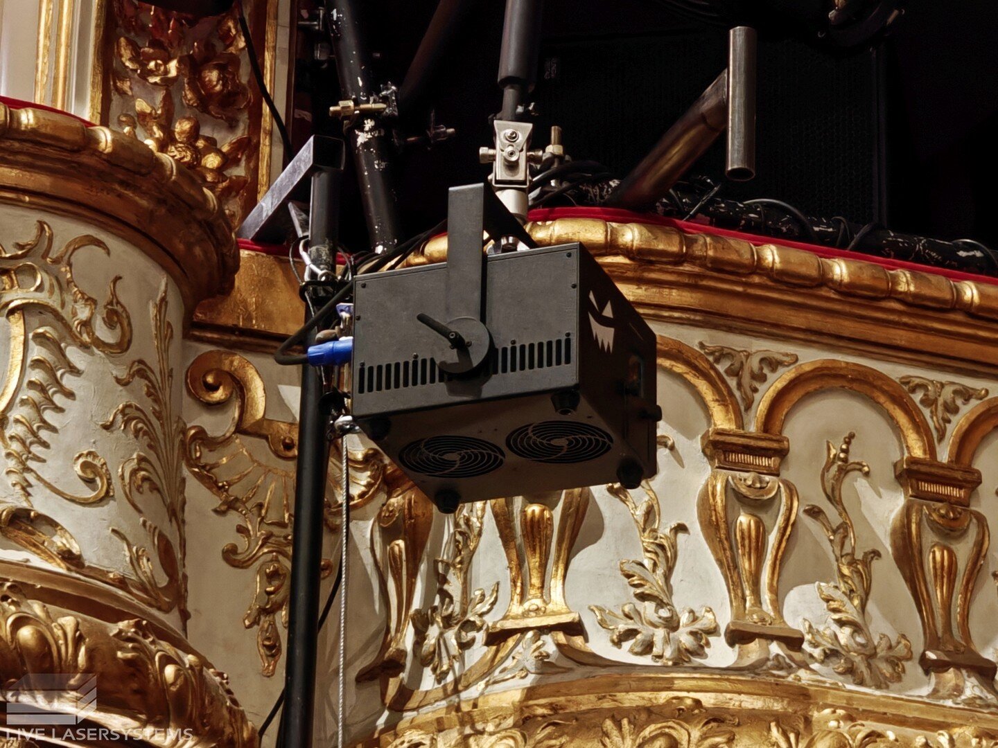 For his interpretation of "Die Angestellten", director Alexander Giesche had the idea of a liquid sky that spreads into the auditorium of the Volkstheater. The architecture of the parquet presented a major challenge here. Minimum heights could not be adhered to and so a solution had to be found that was safe but still clearly visible. In close collaboration with independent experts, we developed a custom version of our KORE series and were able to create an impressive experience that is safe for all spectators - even if they look directly into the laser beams.
