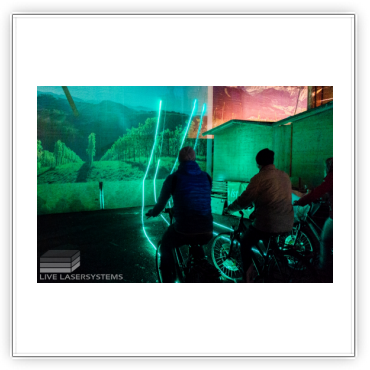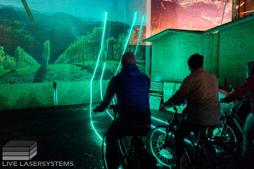 People start pedaling, and LED stripes visualize the power they put into the "system". Once all 8 bikes reach the end of the LED strip, a laser projection starts to draw a comprehensive logo (3x KORE 12 HD lasers were used). The speed of the drawing depends on the peoples pedaling input. During this "build-up"-time music keeps looping. Finally the logo is completely drawn and a finishing music blends over. Final credits are projected telling the bike riders how far they traveled, showing final custom messages and the sponsor's logo.