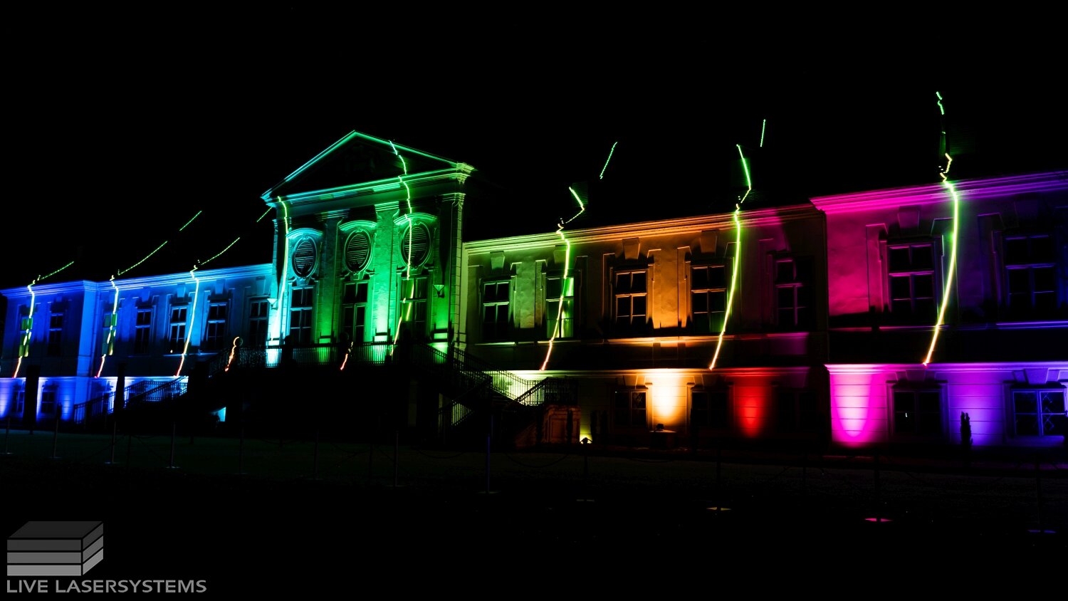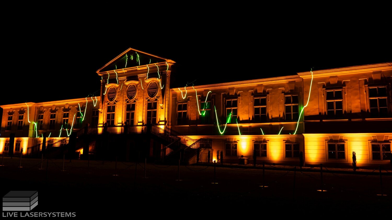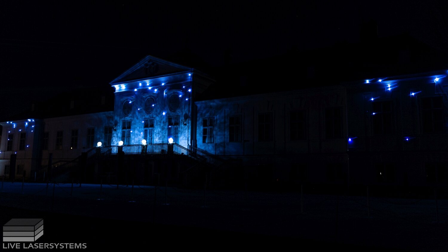 The content creation (laser&lights) was fully performed by LIVE Lasersystems' very own designer Martin Nowosad who previsualized the whole show with Depence². Graphics projections as well as contour mappings were ditributed over the whole building using a complex multi-zone setup. Besides this, the laser projection featured custom 3D mapped particle effects which interacted with the lighting installations. The whole multimedia installation was designed to run fully automated according to a fixed time schedule and were synchronized using timecode.