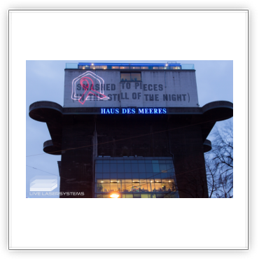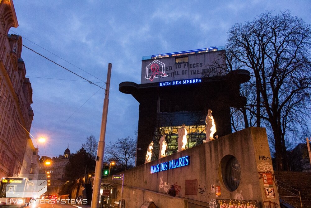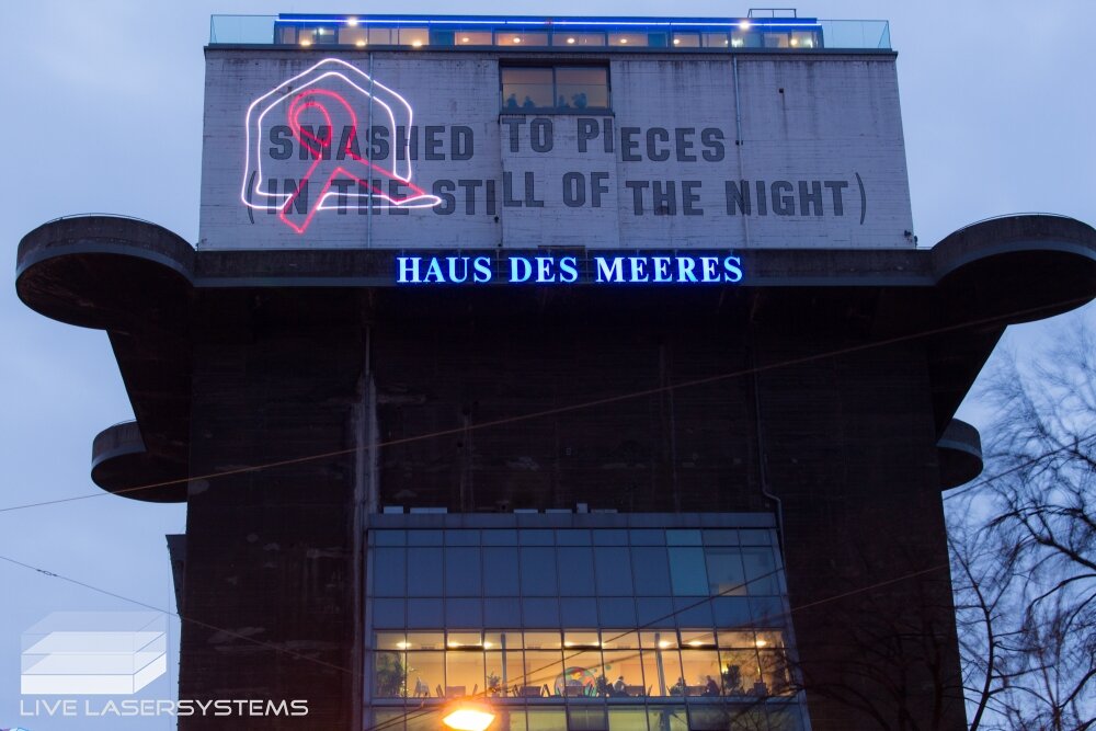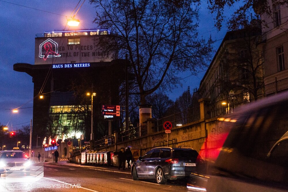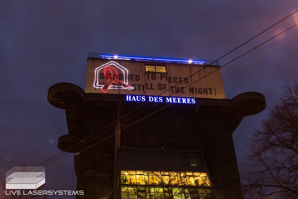 After a successful cooperation in 2015, LIVE Lasersystems was again responsible for a projection on occation of World-Aids-Day 2016. The days before as well as on the 1st of December LIVE Lasersystems projected a logo and a running text onto the facade of the Vienna Aqua Terra Zoo.